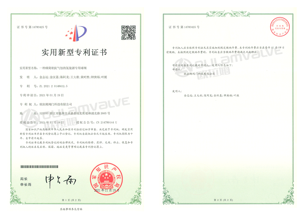 本實用新型公開了一種蜂窩狀抗氣蝕的氫能源專用球閥,包括第一閥座與第二閥座,所述第二閥座連接在第一閥座一端,所述第一閥座與第二閥座之間設有閥球,所述閥球表面開設有通孔,所述通孔貫穿閥球,介質通過通孔經過球閥,所述閥球頂端連接有閥桿,所述閥桿用于控制閥球的轉向;通過在閥球上開設通孔,介質通過通孔經過球閥,通孔可以增大流體介質阻力和摩擦損失,降低介質通過流道的流速,介質通過通孔后相互撞擊的流體形成的湍流促使流體介質中析出的氣體氣泡在遠離金屬零部件表面發生破裂,減少對閥座的氣蝕,消除噪聲和振動,降低閥門的能量消耗。