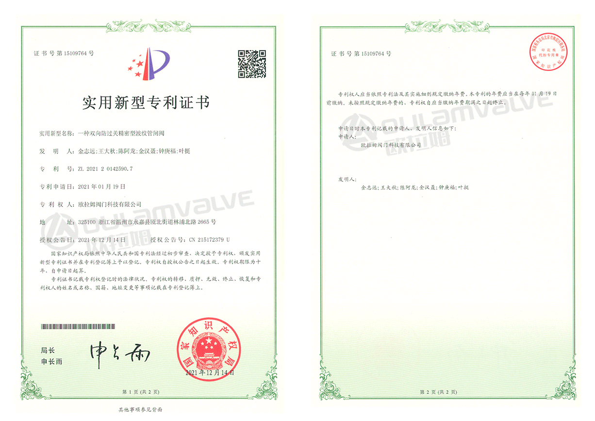 本實用新型公開了一種雙向防過關(guān)精密型波紋管閘閥,包括閥體,閥體內(nèi)橫向穿設(shè)有流道,閥體的頂端上固定安裝有閥蓋,閥蓋的上方連接有填料函,填料函上固定有填料壓板,流道的中部安裝有閘板,閘板的兩側(cè)上下對稱固定有閥座,閥座與閘板密封配合,且閥座的上方固定連接有閥桿,閥桿的外部設(shè)置有空腔,空腔向上延伸,并且空腔上方內(nèi)設(shè)有套在閥桿外側(cè)的波紋管,位于波紋管下方的閥桿兩側(cè)對稱開設(shè)有定位槽,定位槽內(nèi)安裝有可拆卸的定位開環(huán),閥桿向上貫穿并延伸至填料壓板外部,其頂端上固定連接有手輪。定位開關(guān)使閘閥在具有反向過關(guān)的同時,增加了正向過關(guān),實現(xiàn)了雙向過關(guān)。