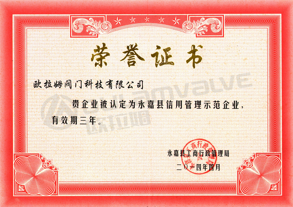 永嘉縣信用管理示范企業證書