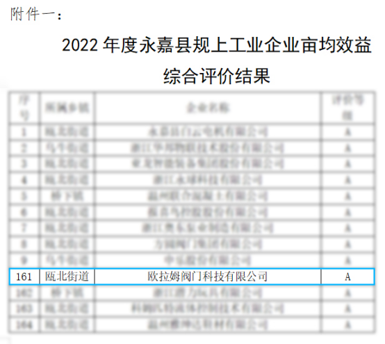 永嘉縣畝均效益“英雄榜”出爐!歐拉姆閥門獲評(píng)A類企業(yè)