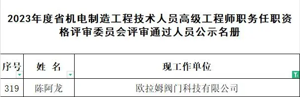 近日,浙江省人力資源和社會(huì)保障廳發(fā)布《2023年度浙江省機(jī)電制造專業(yè)高級(jí)工程師專業(yè)技術(shù)職務(wù)任職資格評(píng)審會(huì)議評(píng)后公示》,經(jīng)過(guò)嚴(yán)格的評(píng)審認(rèn)定,共有1872位優(yōu)秀人才脫穎而出,歐拉姆閥門(mén)科技有限公司工程師陳阿龍上榜。