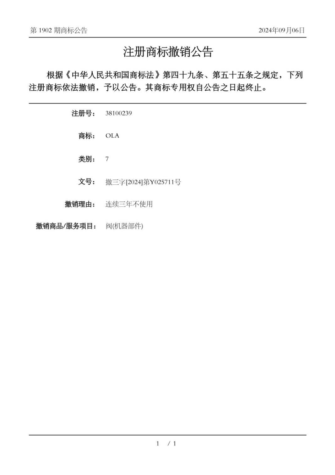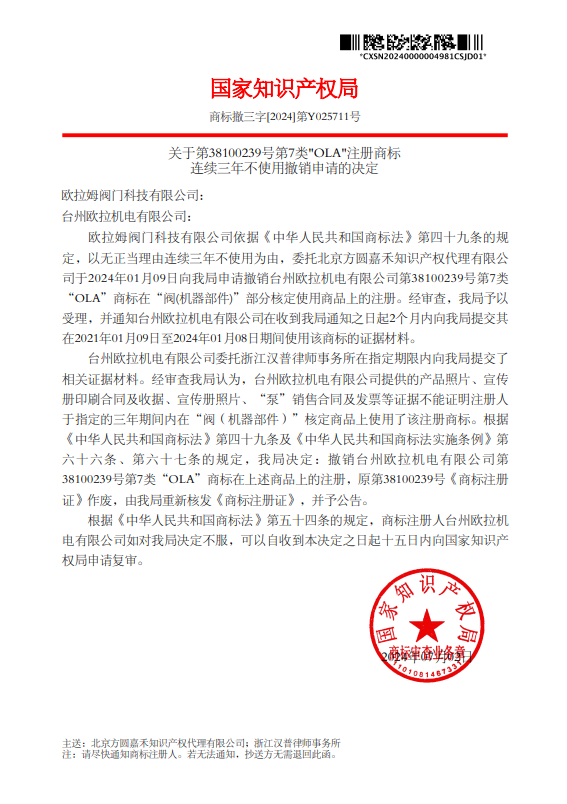 知識(shí)產(chǎn)權(quán)局決定:接受歐拉姆閥門科技有限公司的撤銷申請(qǐng),撤銷臺(tái)州歐拉機(jī)電有限公司第38100239號(hào)第7類“OLA”商標(biāo)在上述商品上的注冊(cè),原《商標(biāo)注冊(cè)證》作廢,并將重新核發(fā)《商標(biāo)注冊(cè)證》并公告。