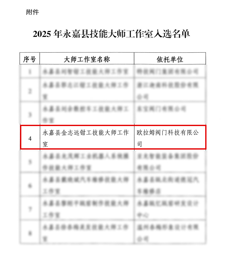近日,浙江永嘉縣委人才工作領導小組辦公室、永嘉縣財政局、永嘉縣人力資源和社會保障局聯合發布《關于公布2025年永嘉縣技能大師工作室名單的通知》,歐拉姆閥門科技有限公司高級鉗工技師金志遠領銜的“永嘉縣金志遠鉗工技能大師工作室”成功入選。作為全縣8家獲認定工作室之一,標志著歐拉姆閥門在高端閥門制造領域的技術傳承與創新突破邁入新階段。